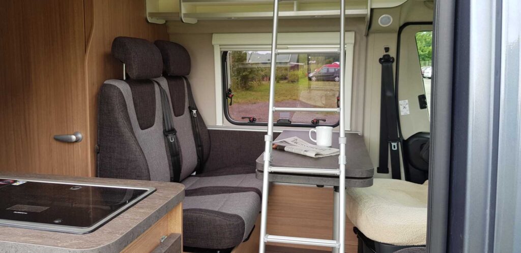 Fahrer und Beifahrersitz drehbar, Tisch mit ausdrehbarer Verlängerung.